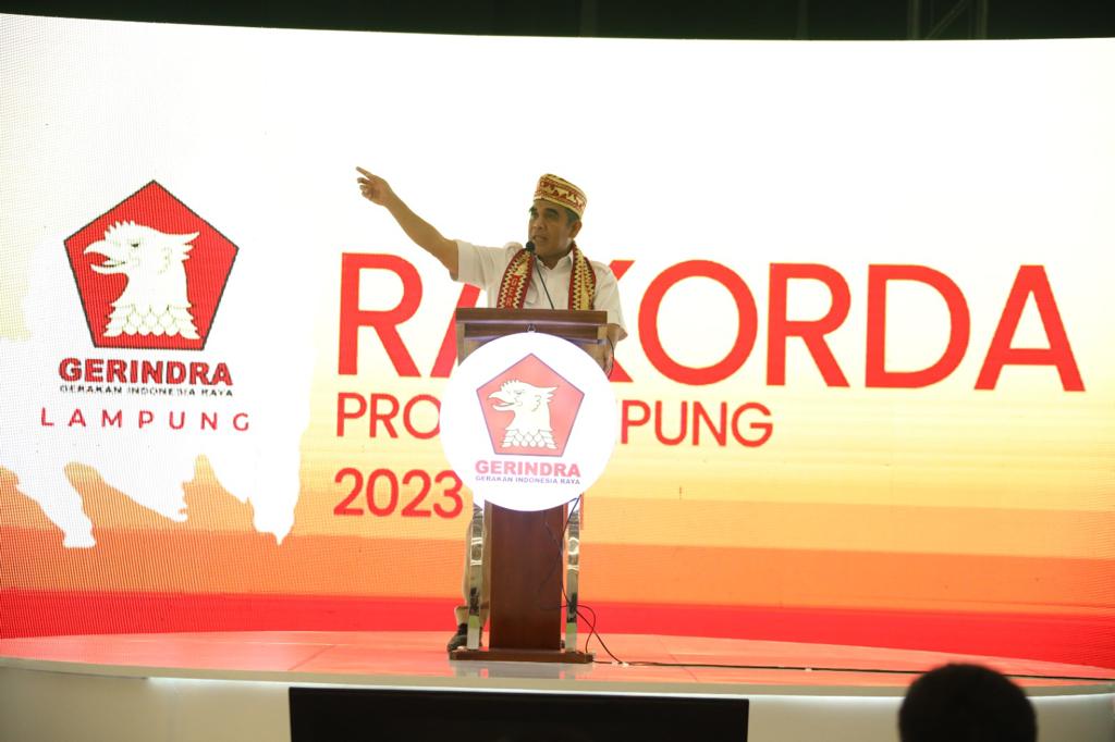 Sekretaris Jenderal Partai Gerindra Ahmad Muzani menghadiri Rapat Koordinasi Daerah (Rakorda) DPD Gerindra Lampung, Rabu (14/6). Pada kesempatan ini Muzani meminta para kader Gerindra di Lampung untuk terus bekerja keras demi memenangkan Prabowo Subianto sebagai presiden pada Pilpres 2024.